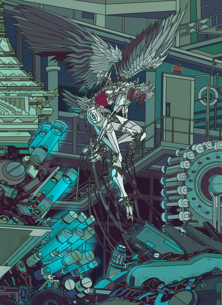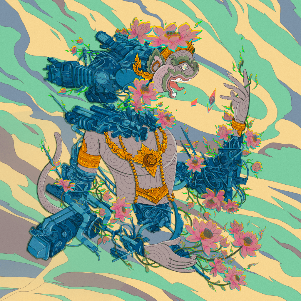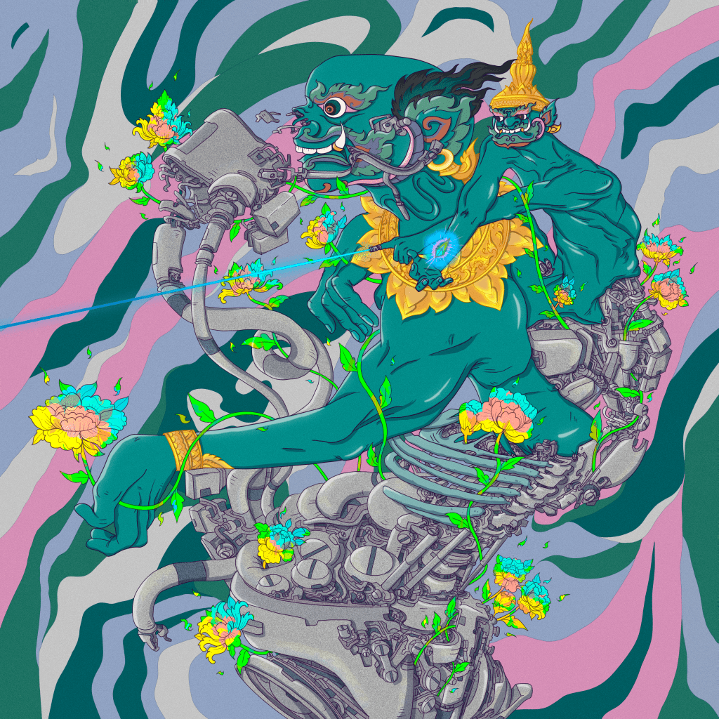 Today, there are still people who love ancient Thai art and would like to present it to the world, including me. Therefore, Heart giving birth to a style called “Thaiberpunk”, a form of ancient Thai art that is easier for people to understand ancient Thai art and also prevent Thai art from extinction.